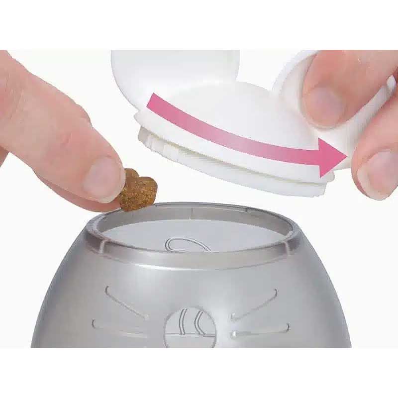 • Fácil de llenar: El compartimento interior del dispensador es fácil de llenar girando la parte superior, lo que facilita la recarga de golosinas para tu gato.