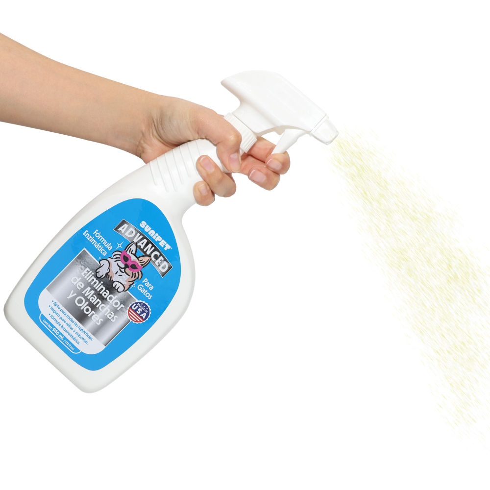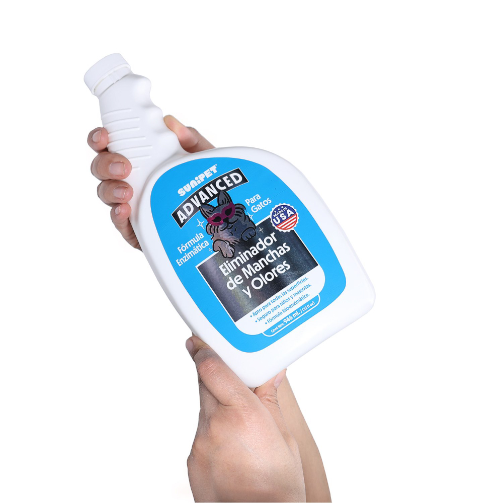 El Sunienzimático de Sunipet es un eliminador de olores y manchas de orina, fecas, vómito y otras manchas orgánicas producidas por su gato. Su fórmula Enzimática, es única, ya que elimina los restos biológicos y las feromonas, evitando marcajes por la atracción de las mascotas por éstas áreas manchadas. Esta fórmula con aroma cítrico es muy agradable, segura para niños y mascotas, respetuosa con el medio ambiente y se fabrica en EE. UU, con los más altos estándares de calidad. Tan suave que ha sido certificado como seguro para ser aplicado en todas las superficies, ganando el sello de aprobación por The Carpet and Rug Institute (CRI). Libre de cloro y color. Envase de 946 ml.
