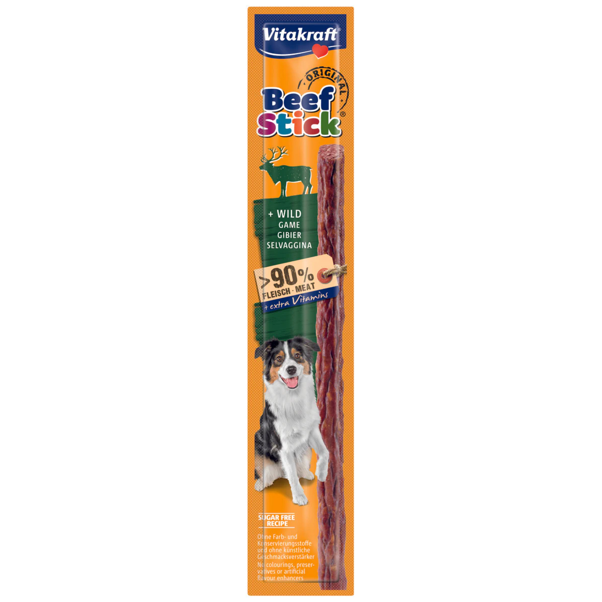 Vitakraft Beef-Sticks es un alimento complementario para perros. Alimente a su perro un stick, ya sea entero o en trozos más pequeños, como una golosina entre comidas o como recompensa.